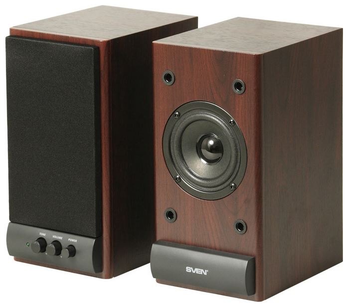 Управление на передней панели колонки (громкость, тембр ВЧ), Деревянный корпус колонок и увеличенный ход катушки динамиков позволяет воспроизводить звук практически без искажения