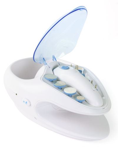4 диска с шероховатой поверхностью, фетровый диск для шлифовки и полировки, шарообразная насадка, малая конусная насадка, лопаткообразная насадка, большая конусная насадка, круглая щеточка, малая цилиндрическая насадка, палочка для удаления кутикулы